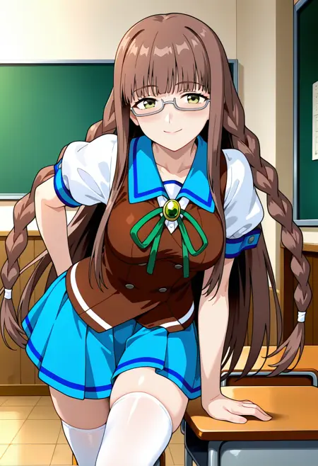 sakajo_hikaru, brown hair, long hair, twin braids, sidelocks, green eyes, breasts,