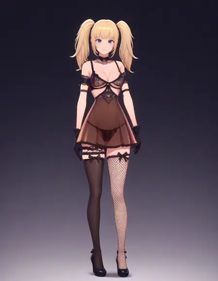 ランジェリー風衣装、レースの首輪、レース、腕ストラップ、黒いブラ、アンダーブレスト、黒い手袋、下着、透けているスカート、黒いパンツ、太ももストラップ、足元の色違い、フィッシュネットのハイソックス、リボン、黒いハイヒール