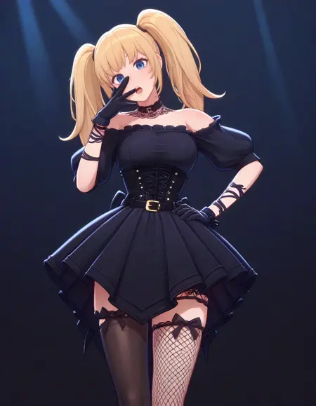ゴシック風衣装、レースの首輪、フリル、黒いドレス、オフショルダー、コルセット、ベルト、黒い手袋、太ももストラップ、足元の色違い、フィッシュネットのハイソックス、リボン、黒いハイヒール