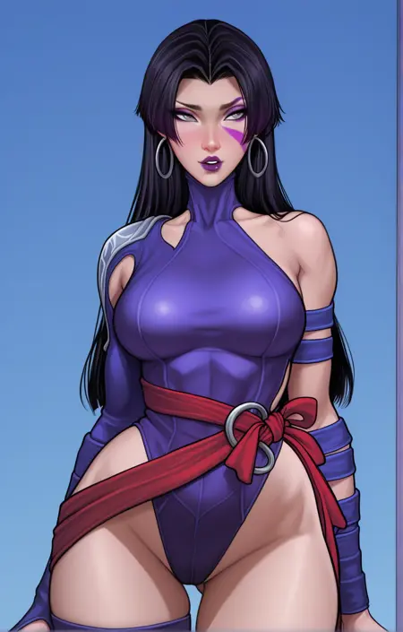 Psylocke, 1girl, 회색 눈, 보라색 얼굴 무늬, 보라색 립스틱, 갈라진 머리, 긴 검은 머리, 고리 귀걸이, 보라색 레오타드, 긴 소매, 한쪽 어깨 노출, 빨간 허리 밴드, 다리 노출,