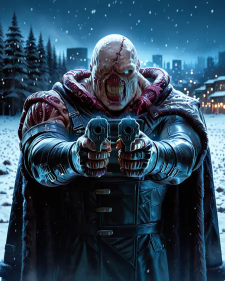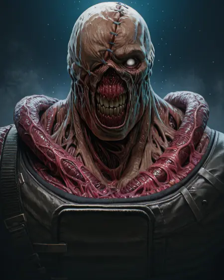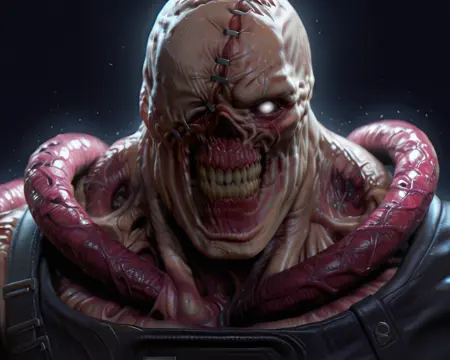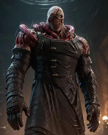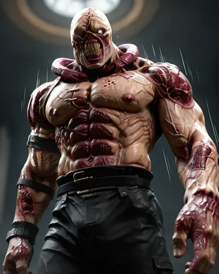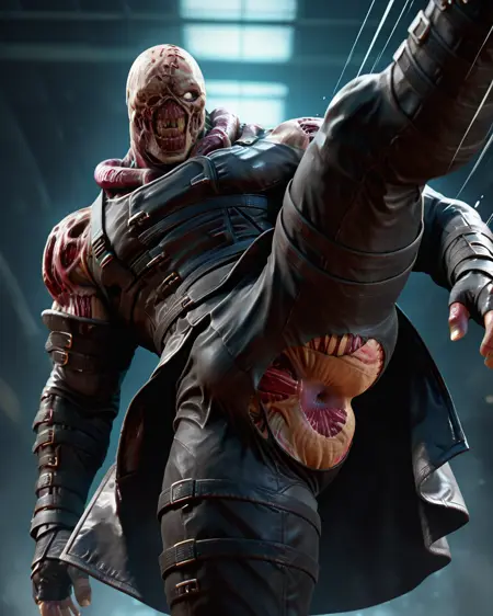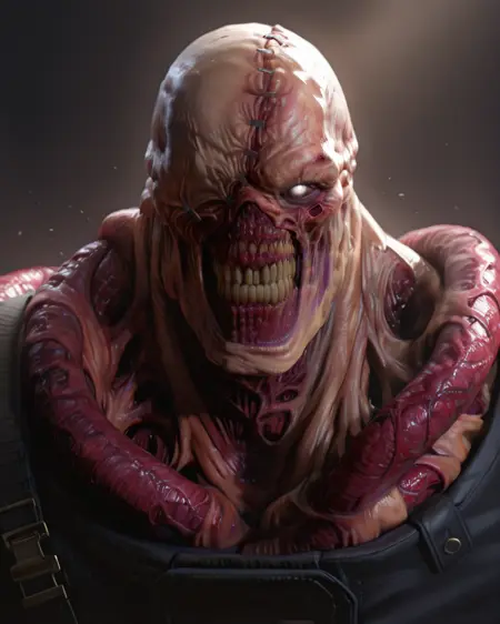 monster, one eyed, bald,ugly skin, zombie skin, Black boots, black bodysuit, long black leather coat, strapped gauntlets, stitched flesh, exposed teeth, white eyes, fleshy, tentacle-like around neck, stitches, muscular