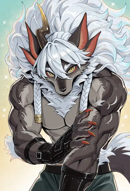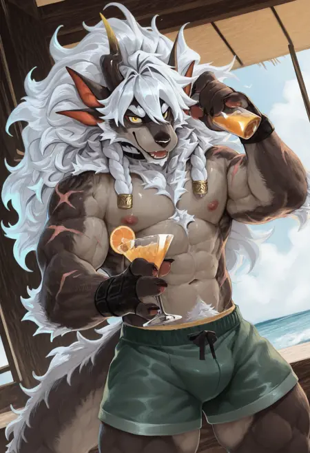 Illustrious: best quality, amazing quality, very aesthetic, absurdres, newest, Sui_Zai_Beast_Nian, furry male, furry, male focus, 1boy, solo, muscular, single horn, four ears, muscular male, animal ears, long hair, braid, scar, nipples, white hair, topless, yellow eyes, belt, green shorts, bara, abs, stomach, ...your tags...