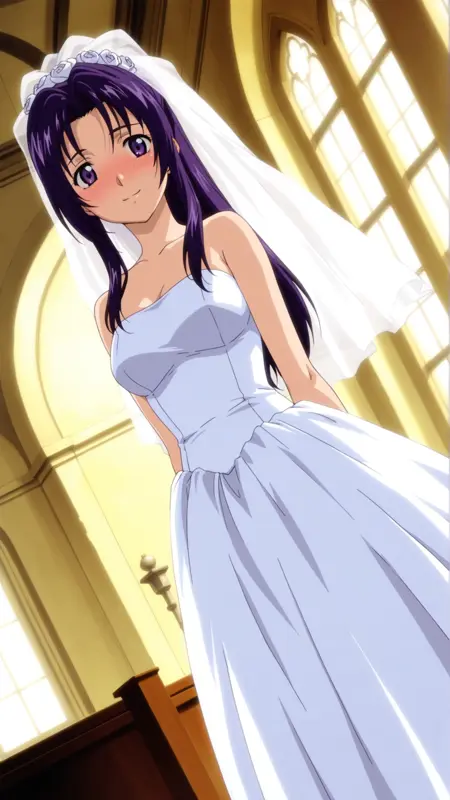 외모: 보라색 머리카락, 보라색 눈, 긴 머리,