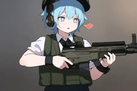 CRN,blue eyes,round eyes,white pupils,light blue hair,green FLC Vest,Utilty Pouch,white shirt,brown shorts,earmuffs,brown Tactical Cap