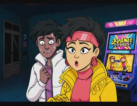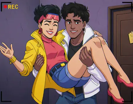 Jubilee and Sunspot from x-men 97. Model needs a little help on multiple character generations, and i obviously suggest using dedicating tools. I also suggest to use western artist tag to aid the generation.
