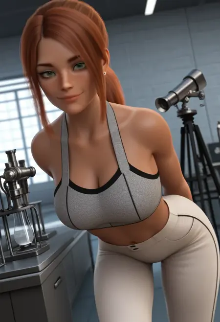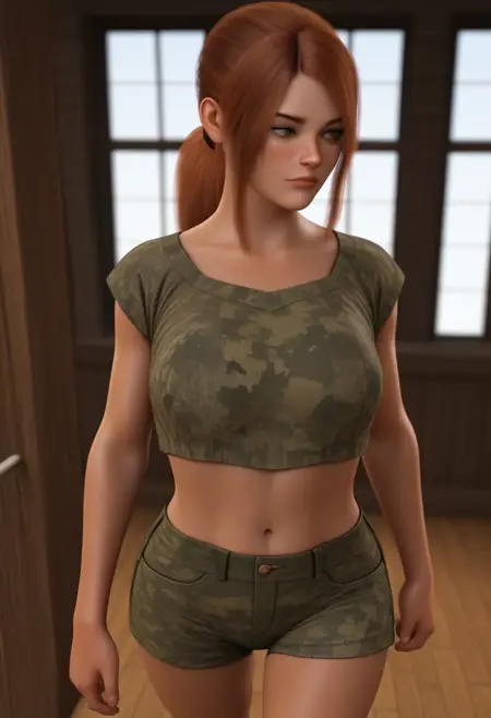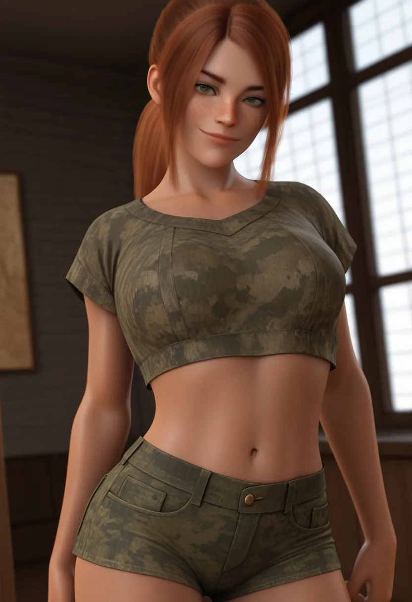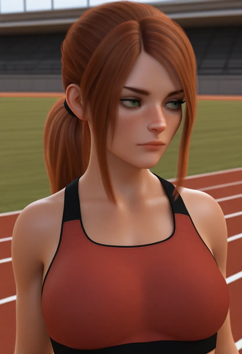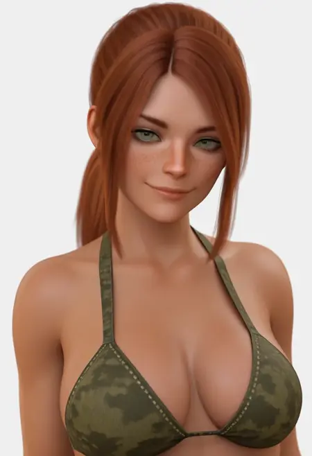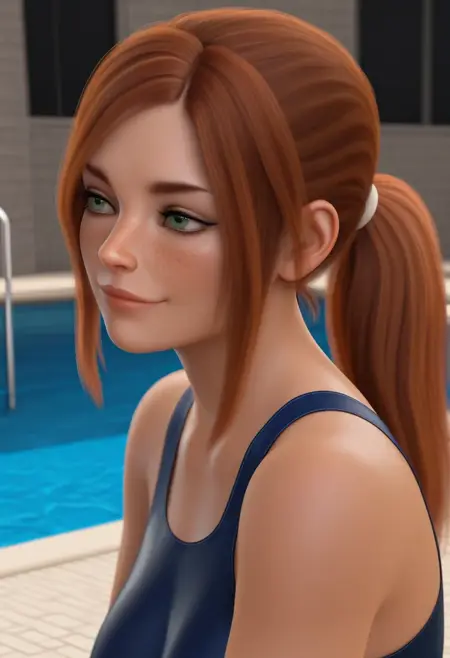 Rosa, brown hair, ponytail, green eyes, long hair, lips, freckles, closed mouth, sidelocks,