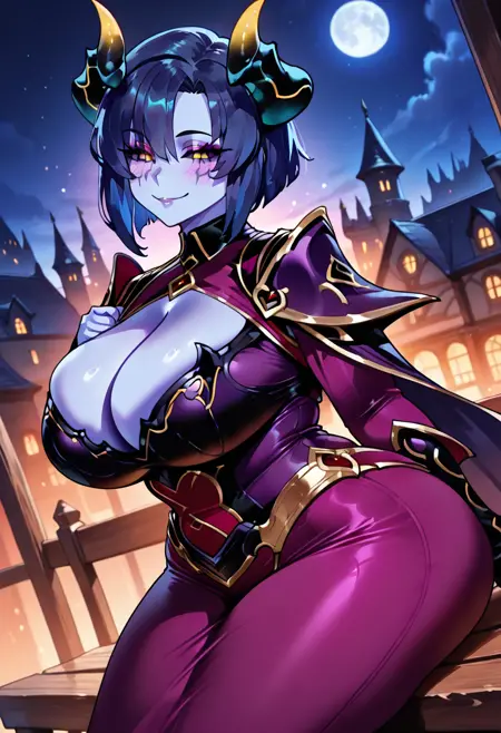 lora:OC\_ValentiaLodrim-Illustrious:1,valentia_lodrim,1girl,solo,dark blue hair,short hair,colored skin,blue skin,colored sclera,golden-yellow eyes,eyeshadow,thick thighs,wide hips,curvy,huge breasts,cleavage,horns,purple dress,cleavage cutout,clothing cutout,cape,