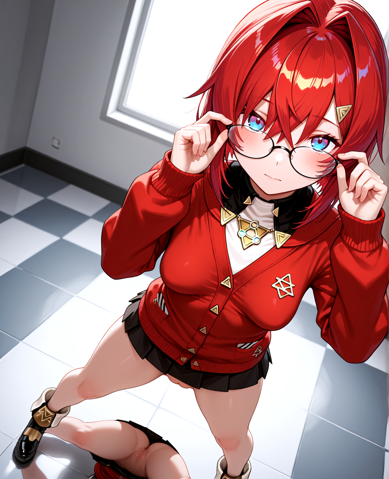 reflective floor, reflection, upskirt, from above, tile floor, reflective surface, panties,