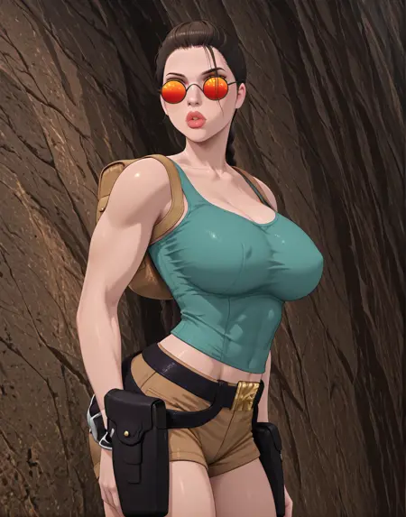 nudraiLC, lara croft, tomb raider, backpack, holster, sunglasses, tinted eyewear, puffy lips, thick lips, large breasts, hip holster belt,