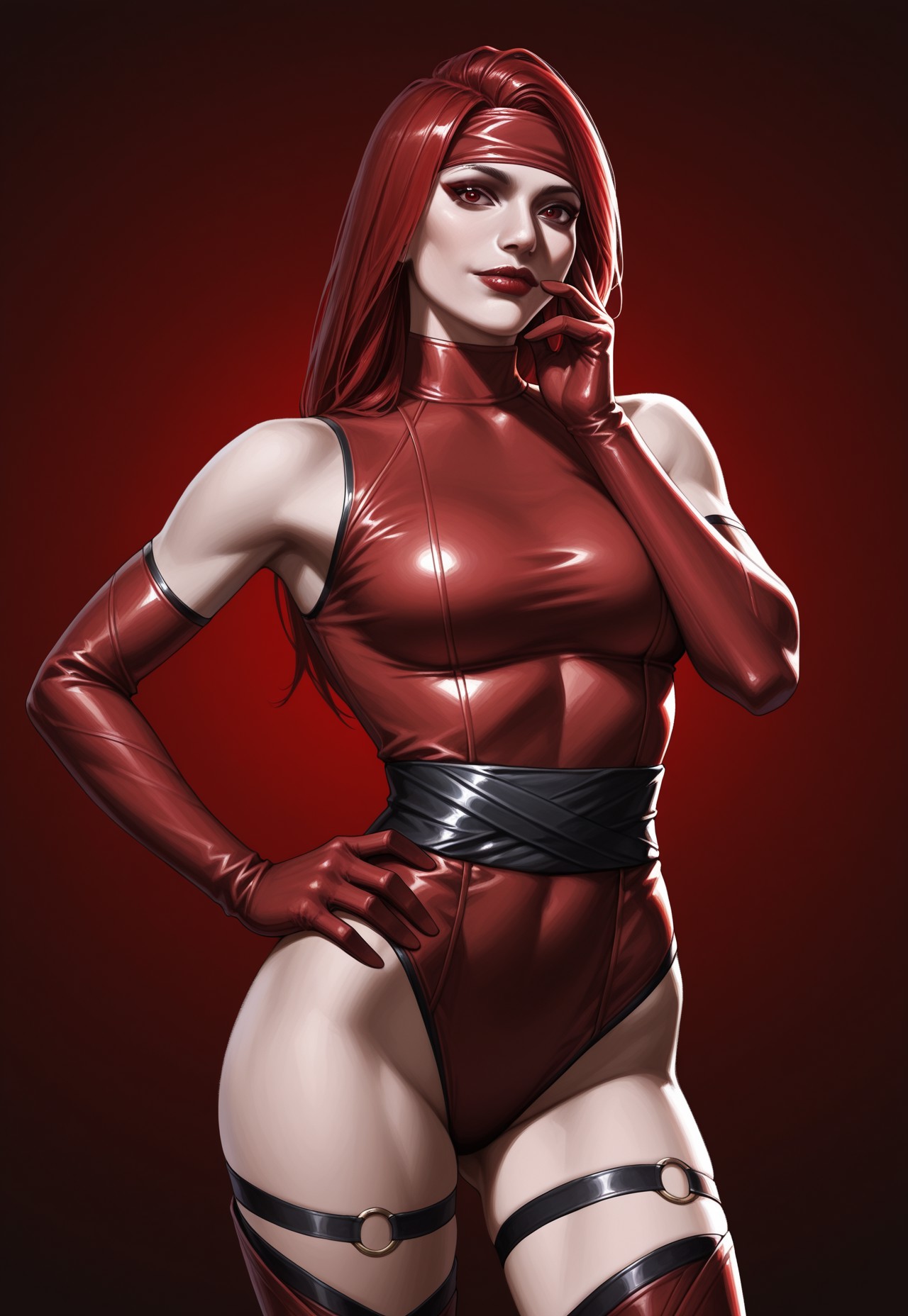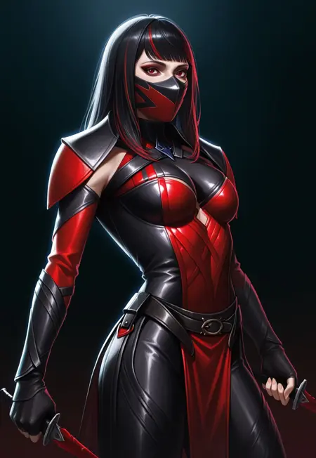 빨간 마스크, 빨간 헤드밴드, 레오타드, 소매 없음, 스카프, 빨간 팔꿈치 장갑, 허벅지 스트랩, 허벅지 부츠,
