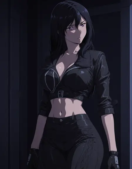 (((source_anime, anime coloring))), 1girl, solo,StioSK, black hair, gloves, long hair, pants, jacket, midriff, black gloves,
