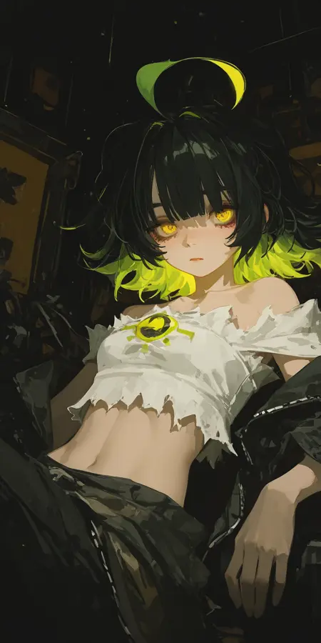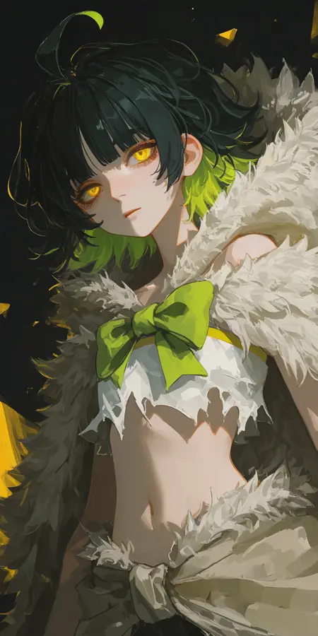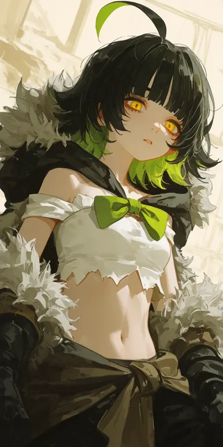 1girl, short hair, blunt bangs, black hair, yellow eyes, green ahoge, multicolored hair, green hair, two-tone hair
