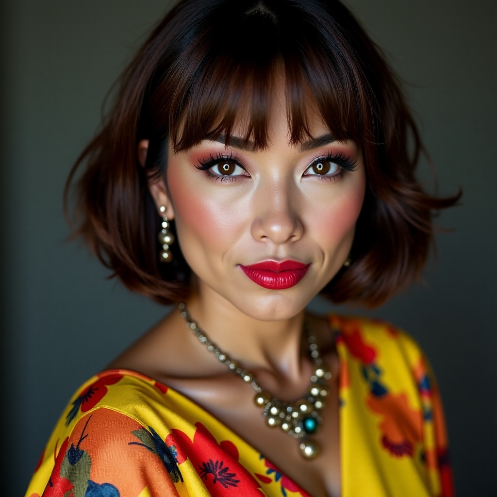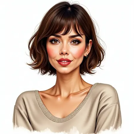 그녀의 '정식' 외모를 원한다면, 나이를 ("중년의 성인 여성") 지정하고, "단발"과 "앞머리"를 추가하세요.