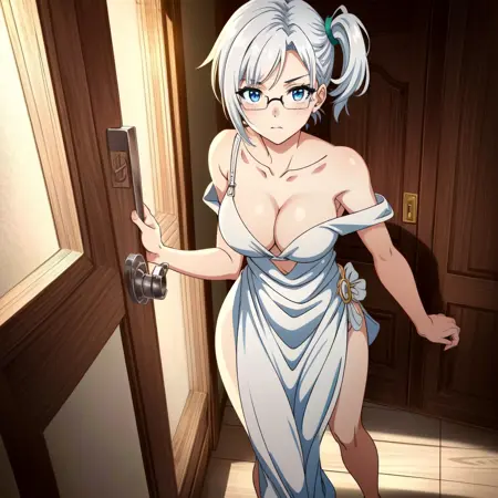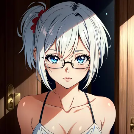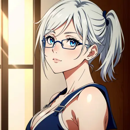 1girl, blush, short hair, solo, blue eyes, bangs, white hair, green dress, side ponytail, glasses