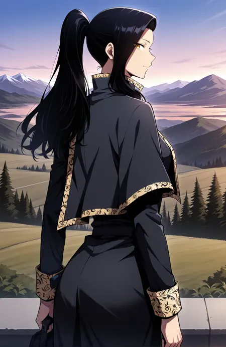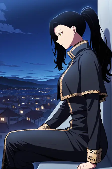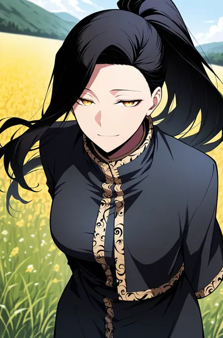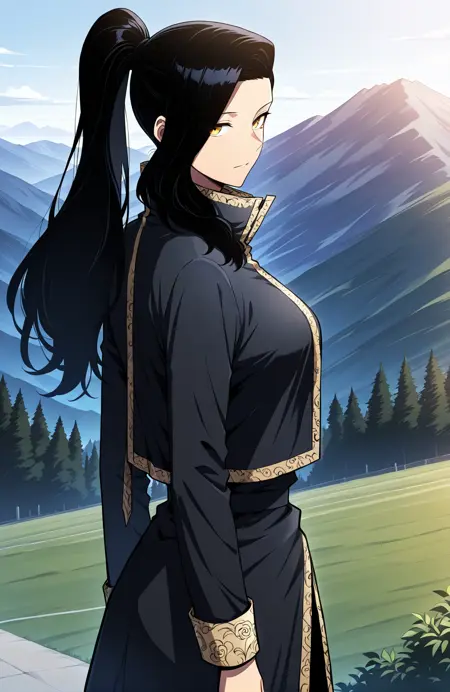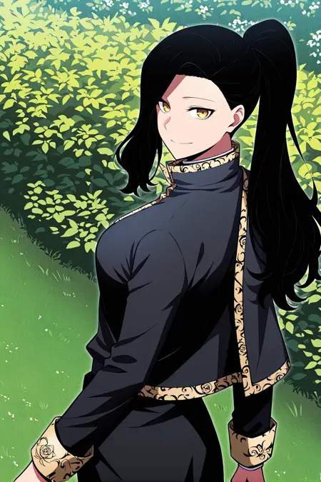 Anne, 1 girl, solo, black hair, long hair, high ponytail, long side bangs, golden eyes, medium skin,