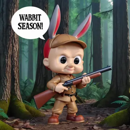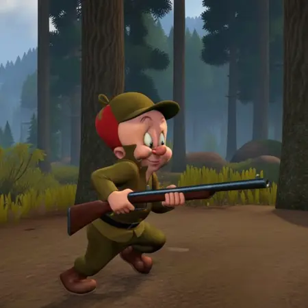 这个结果不错。请用心烘焙约3000步。这个LoRA将为你带来经典的埃尔默·弗德卡通风格。我在其他卡通图像中加入了一些黑白素描、彩色铅笔草图、Funko玩偶以及一些其他写实物品。