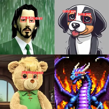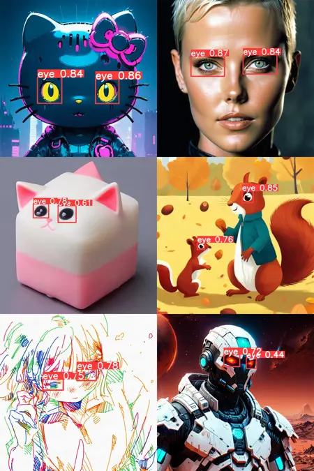 检测能力:本模型拥有强大的自定义训练数据集与专属训练流程,可识别各种风格的眼部图像,包括绘画、艺术风格、3D、写实、动漫、漫画,甚至部分像素艺术。
