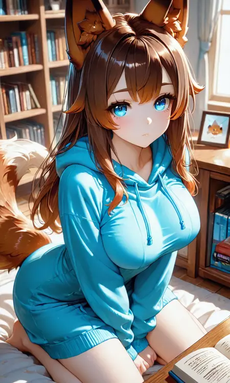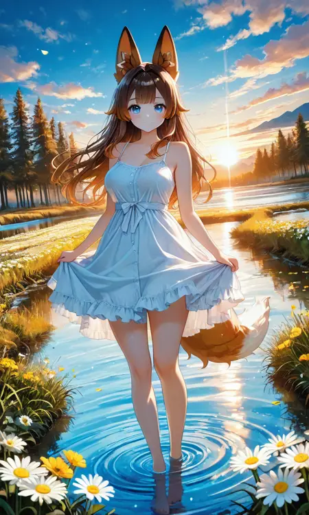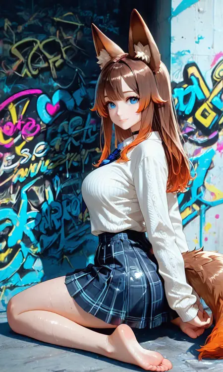 Fox_Girl_Style, animal_ears, fox_ears, long_ears, fox_tail, brown_hair, long_hair, multicolored_hair, gradient_hair, blue_eyes, big_breasts, virgin killer outfit, white shirt, long skirt, pantyhose