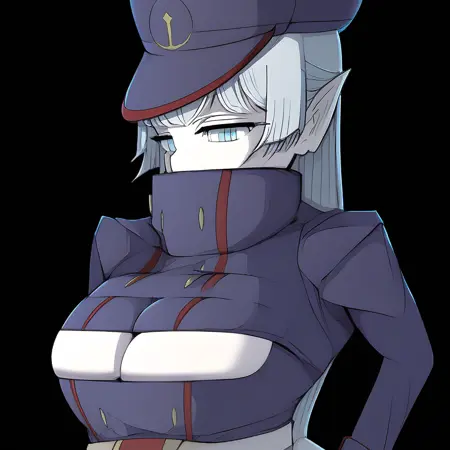 military uniform, peaked cap, high collar, belt, thigh high boots, cleavage cutout,