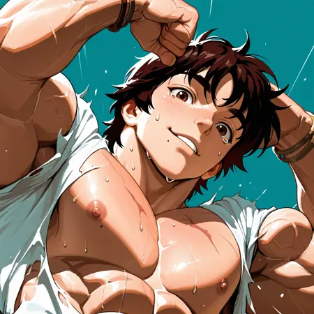 <lora:BAKI:1> baki, male focus, 1boy, muscular, solo, muscular male, short hair, brown hair, black hair, pectorals, manly, scar, topless male, brown eyes, looking at viewer, biceps, closed mouth, upper body, bara, abs, smile, shirt, shorts, scar on arm