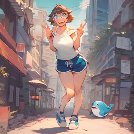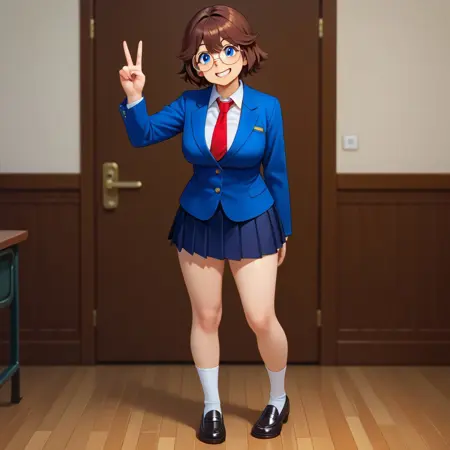 brown hair, short hair, blue eyes, fair skin, large breasts, round glasses,
