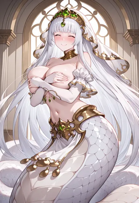gbfechid, 흰 머리, 매우 긴 머리, 둔한 앞머리, 눈 감음, 관모, 색상이 있는 피부, 몬스터 걸, 라미아,