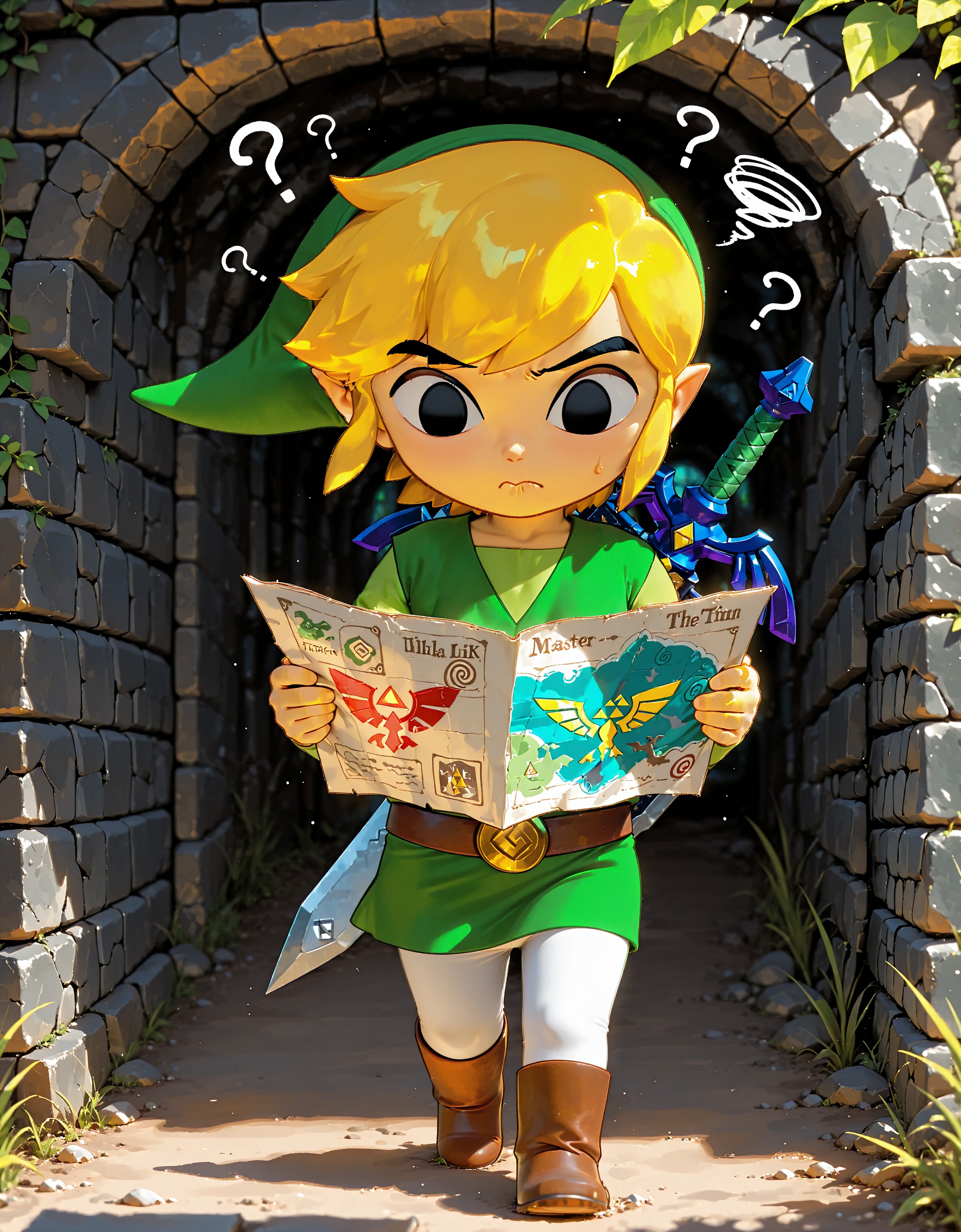 blonde hair, black eyes, boy, toon link, the legend of zelda, pointy ears, holding sword, master sword, holding shield, shield,