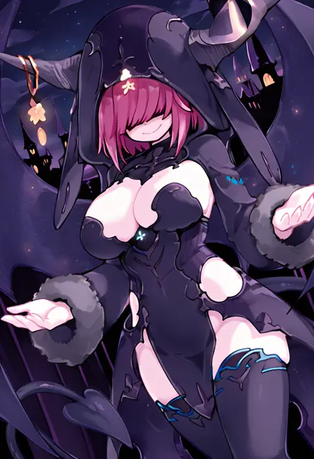 azazel_rpg,1girl,solo,pink hair,short hair,hair over eyes,covered eyes,demon girl,demon horns,demon tail,demon wings,horn ornament,tail ornament,large breasts,cleavage,habit,hood up,long sleeves,fur-trimmed sleeves,black thighhighs,thigh boots,