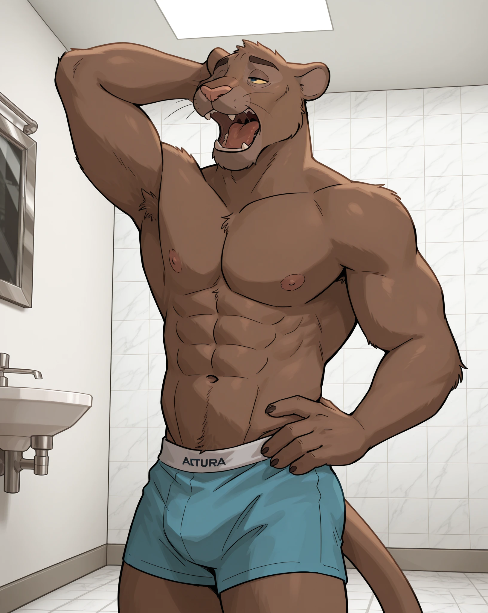 服装: 青いシャツ、カーキ色のズボン、茶色のズボン