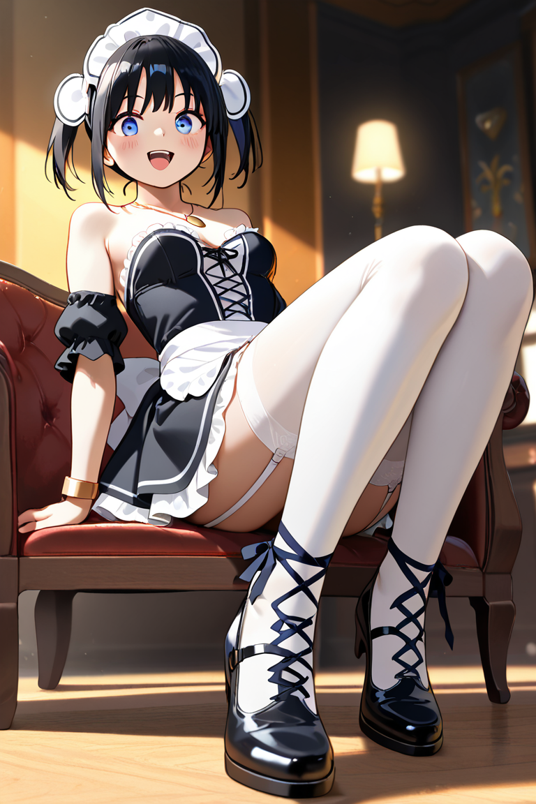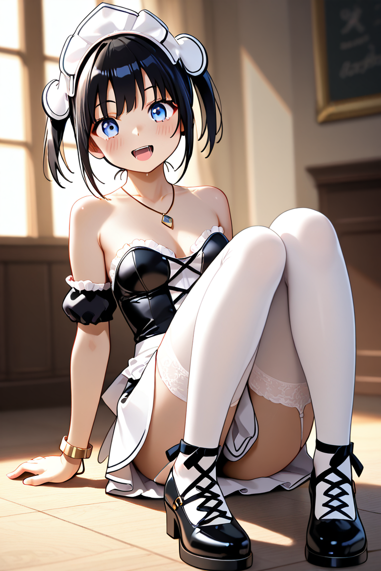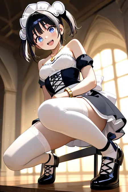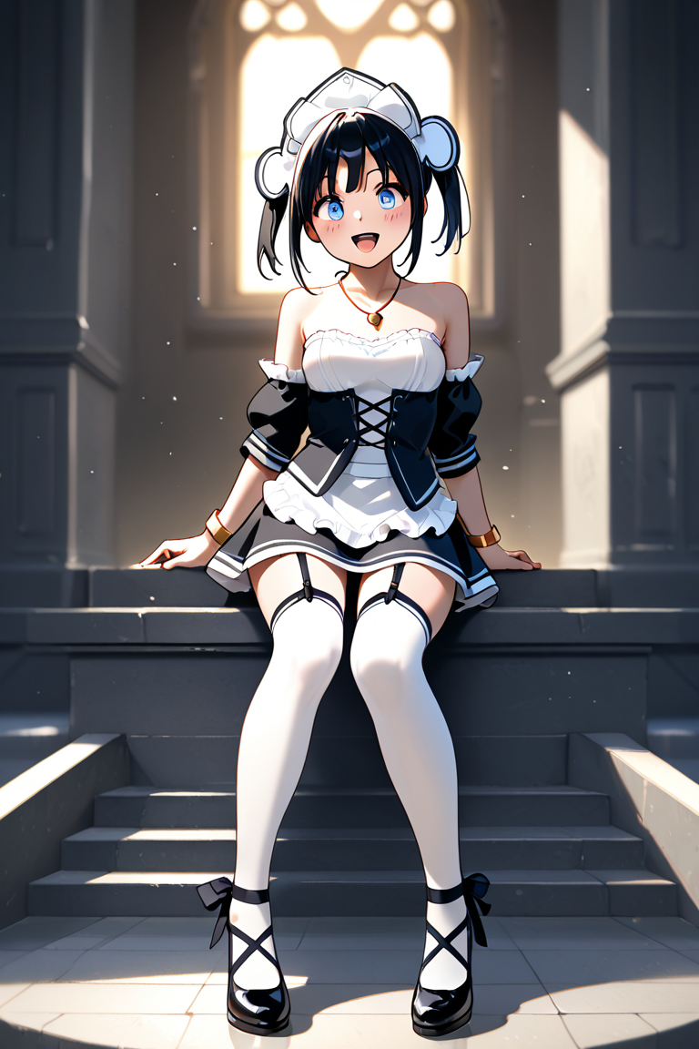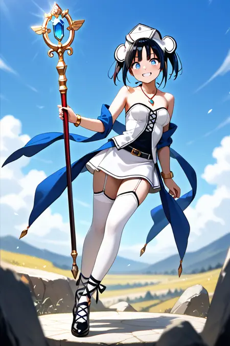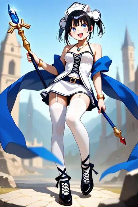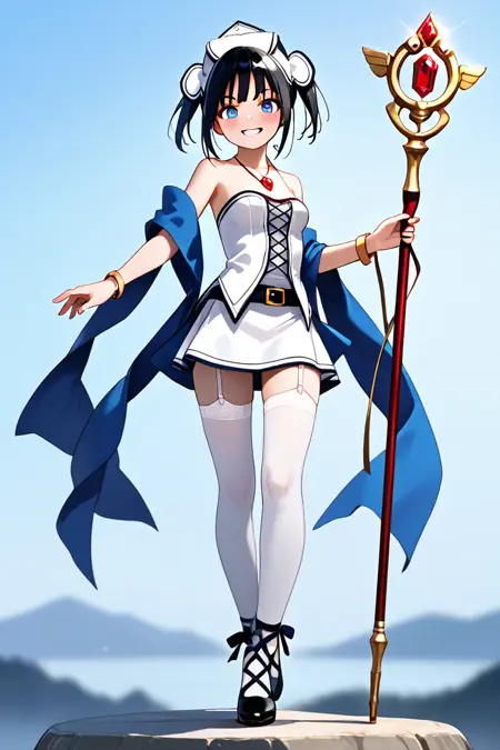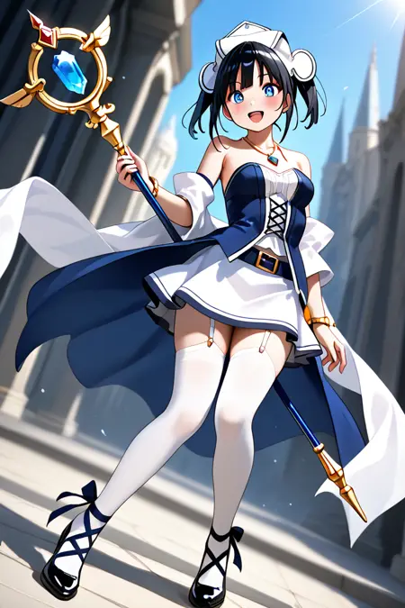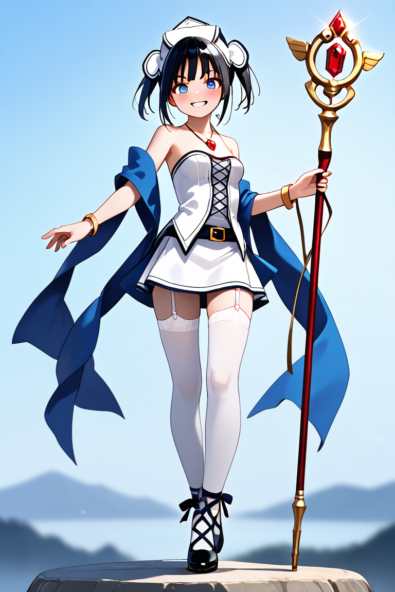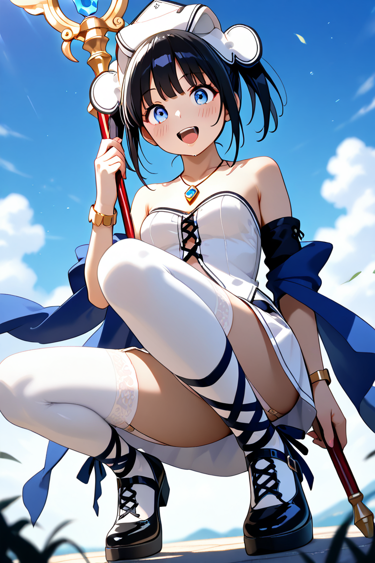 虹膜,1个女孩,单人,看着观众,蓝眼睛,黑发,丝带,珠宝,裸露肩膀,双马尾,中等胸部, detach sleeves,黑鞋,白色超短裙,项链,白色过膝袜,手镯,无肩带,绝对领域,吊颈,吊袜带,宝石,吊坠,交叉系带鞋履,披肩,手持法杖,交叉系带服饰,白色头饰,脚踝系带,鞋履丝带,短发,