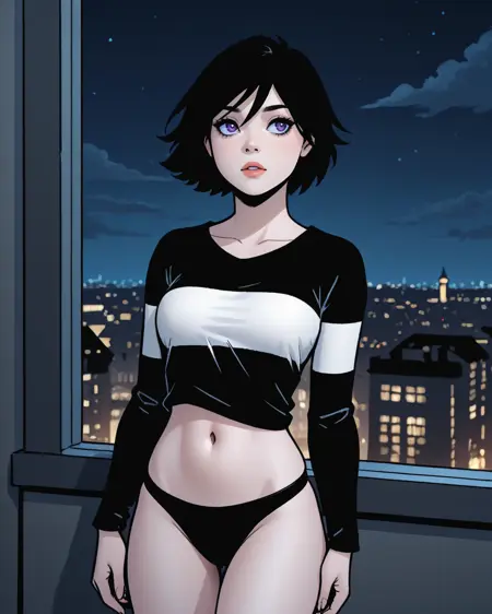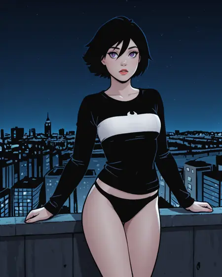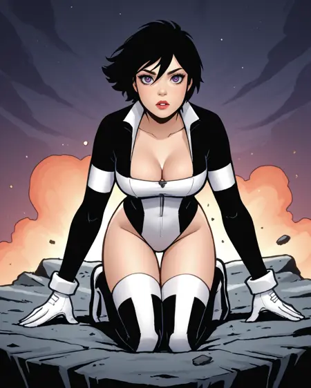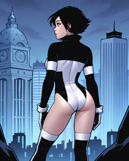 Triggers: atlee, black hair, short hair, purple eyes, leotard, gloves, thighhighs