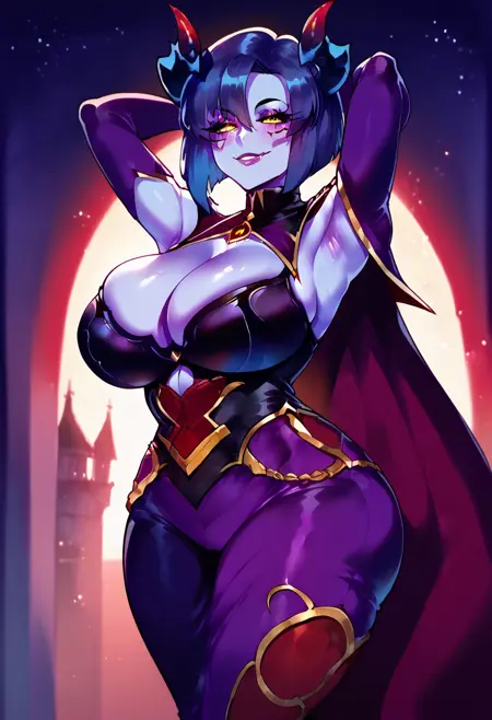 valentia_lodrim,1girl,solo,dark blue hair,short hair,colored skin,blue skin,colored sclera,golden-yellow eyes,eyeshadow,thick thighs,wide hips,curvy,huge breasts,cleavage,horns,purple dress,cleavage cutout,clothing cutout,cape,