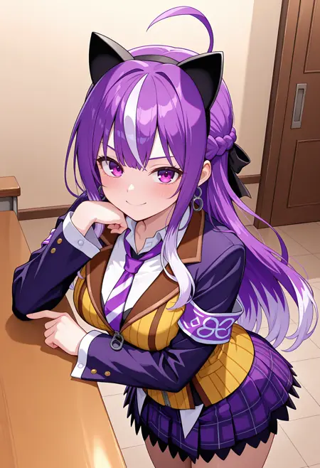 学校制服、ロングヘア、アホ毛、黒リボン、イヤリング、仮想動物耳、イエローベスト、茶色のストライプ、ストライプベスト、ジッパーの引き手、パープルネクタイ、斜めストライプネクタイ、パープルジャケット、ホワイトカラー、シャツ、ロングスリーブ、アームバンド、チェックスカート、プリーツスカート、パープルスカート、靴下、靴