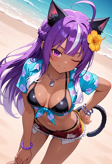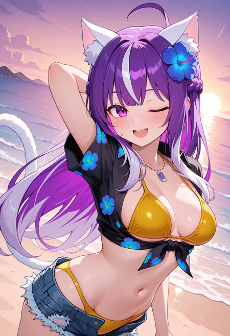 猫耳、ホワイト耳、ホワイトテール、ロングヘア、アホ毛、パープル花、ヘアフローラル、クロップドシャツ、オープンシャツ、ブラックシャツ、ネックレス、ジュエリー、ショートスリーブ、ビーズブレスレット、バングル、フラワープリント、下着にビキニ、イエロービキニ、カットオフ、デニムショート、オープンフライ、アイウェアハング