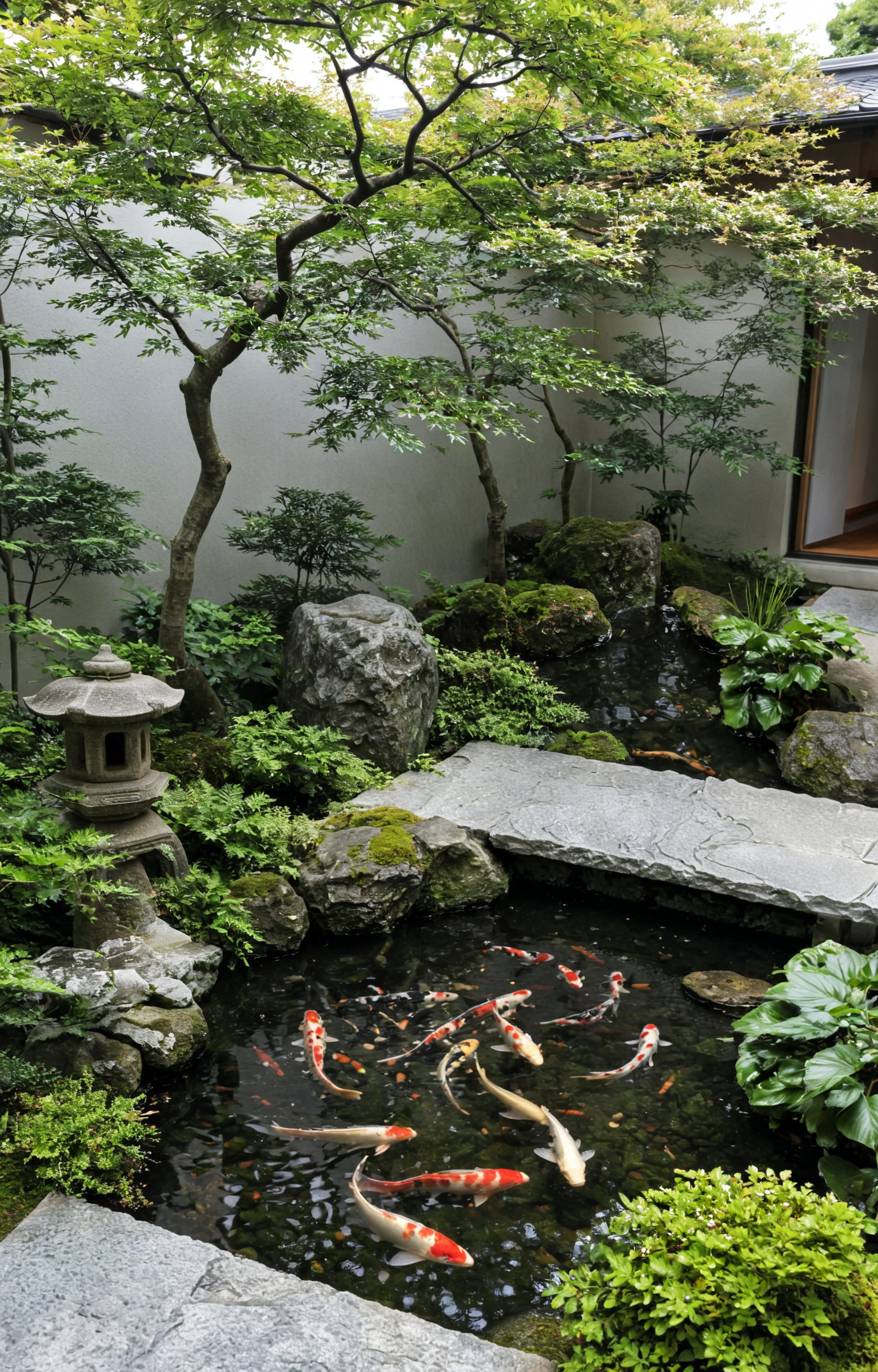 一幅写实风格的现代日本庭院,通过大面积推拉玻璃门与极简住宅起居室相连。庭院中设有一座锦鲤池,池水清澈见底,可见水底卵石与游动的锦鲤。天然石板铺成踏步路径横跨水面。植物配置包括覆盖苔藓的地被、整齐修剪的灌木、观赏树木与阔叶植物,并点缀一座传统石灯笼。布局均衡宁静,岩石自然摆放,晨光柔和投射出真实阴影。材质呈现自然且高品质,展现建筑与景观的和谐统一。氛围宁静、精致、平和、优雅。