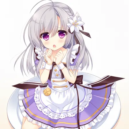 one side up,braid,hair flower,white flower,hair bow,white bow,hair ribbon,brown ribbon,waitress,purple dress,brown bowtie,white shirt,collared shirt,frilled shirt,center frills,white frills,gold buttons,puffy short sleeves,frilled sleeves,waist apron,white apron,frilled apron,lace-trimmed apron,back bow,brown bow,frilled dress,gold trim,white wrist cuffs,