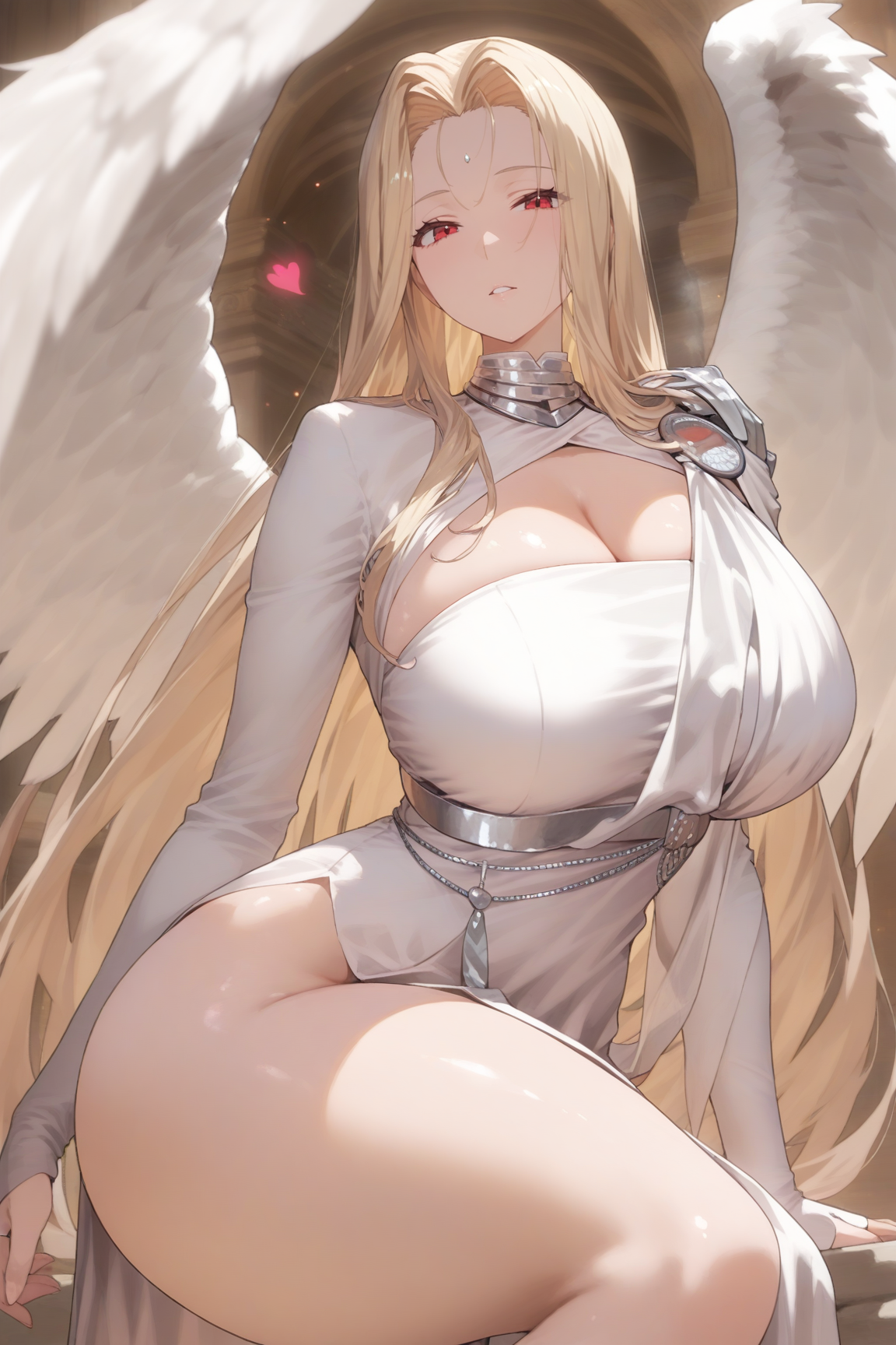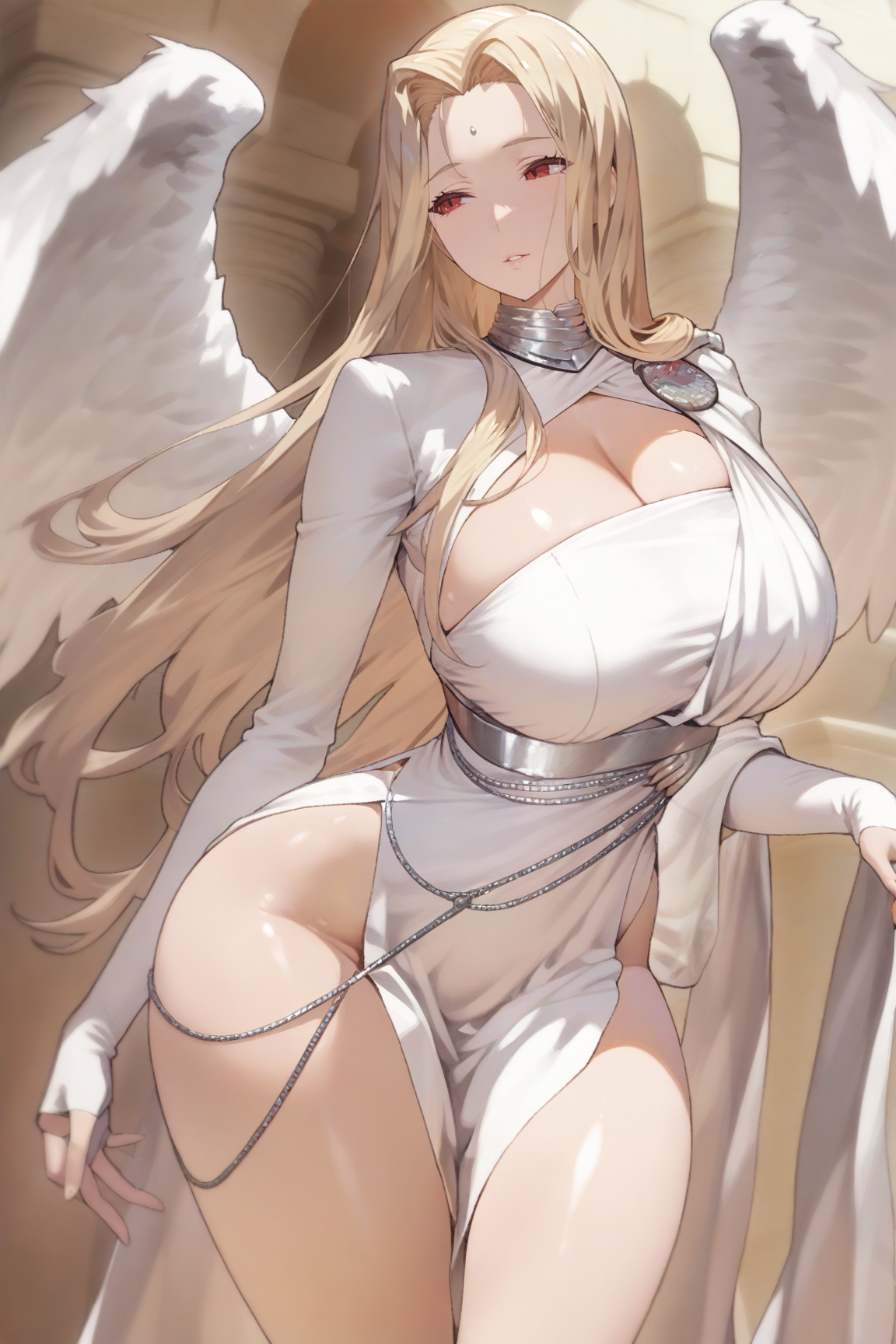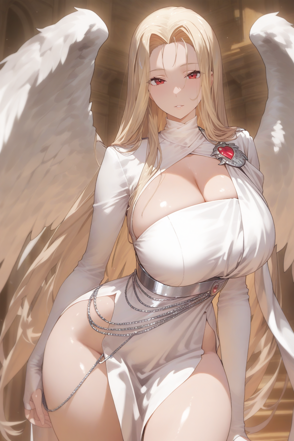 プロンプトタグ: 1girl、成熟した女性、赤い目、金色の髪、長い髪、前髪分け、額の露出、肩の白いブラッチ、白いドレープドレス、胸元、カットアウト、白いボレロシャーグ、指なし袖、銀色のウエストチェーン、骨盤カーテン、白い羽根の翼、白いサンダル