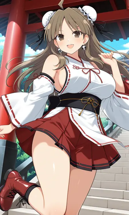 렌카(세난 카구라), 갈색 눈, 긴 갈색 머리, 아호게, 더블 둥, 둥 덮개, 머리 리본, 큰 가슴, 렌카 귀걸이, 허벅지, Renka_Shrine, 신사 복장, 일본 복장, 미코 복장, 흰 키모노 위, 어깨 노출, 긴 소매, 넓은 소매, 오비, 띠, 하카마 치마, 빨간 치마, 빨간 부츠