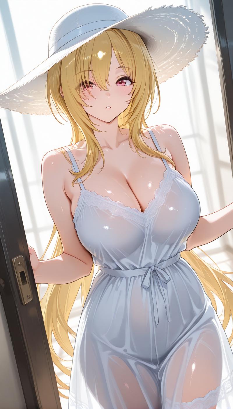ドレス、帽子、胸元、裸の肩、鎖骨、ノースリーブ、白いドレス、裸の腕、ノースリーブドレス、白い帽子、レース縁取り、サンハット、わら帽子、サンドレス、レース、脇のしわ、透けるシルエット、レース縁取りのドレス、裸の脚、