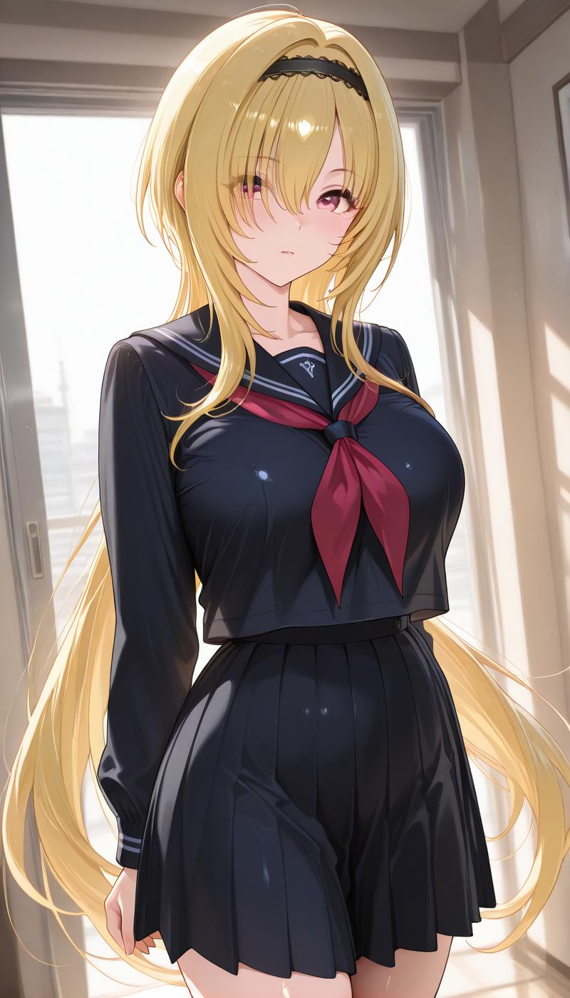 シャツ、スカート、長袖、学ラン、鎖骨、プリーツスカート、ヘアバンド、セーラー服、黒いスカート、セーラー襟、黒いシャツ、ネクタイ、黒いヘアバンド、赤いネクタイ、黒いセーラー襟、黒いセーラー服、ギザギザの線、太もも、