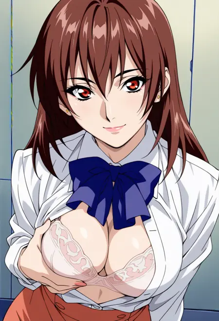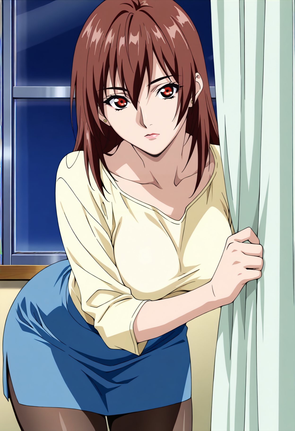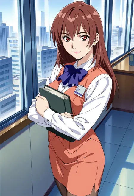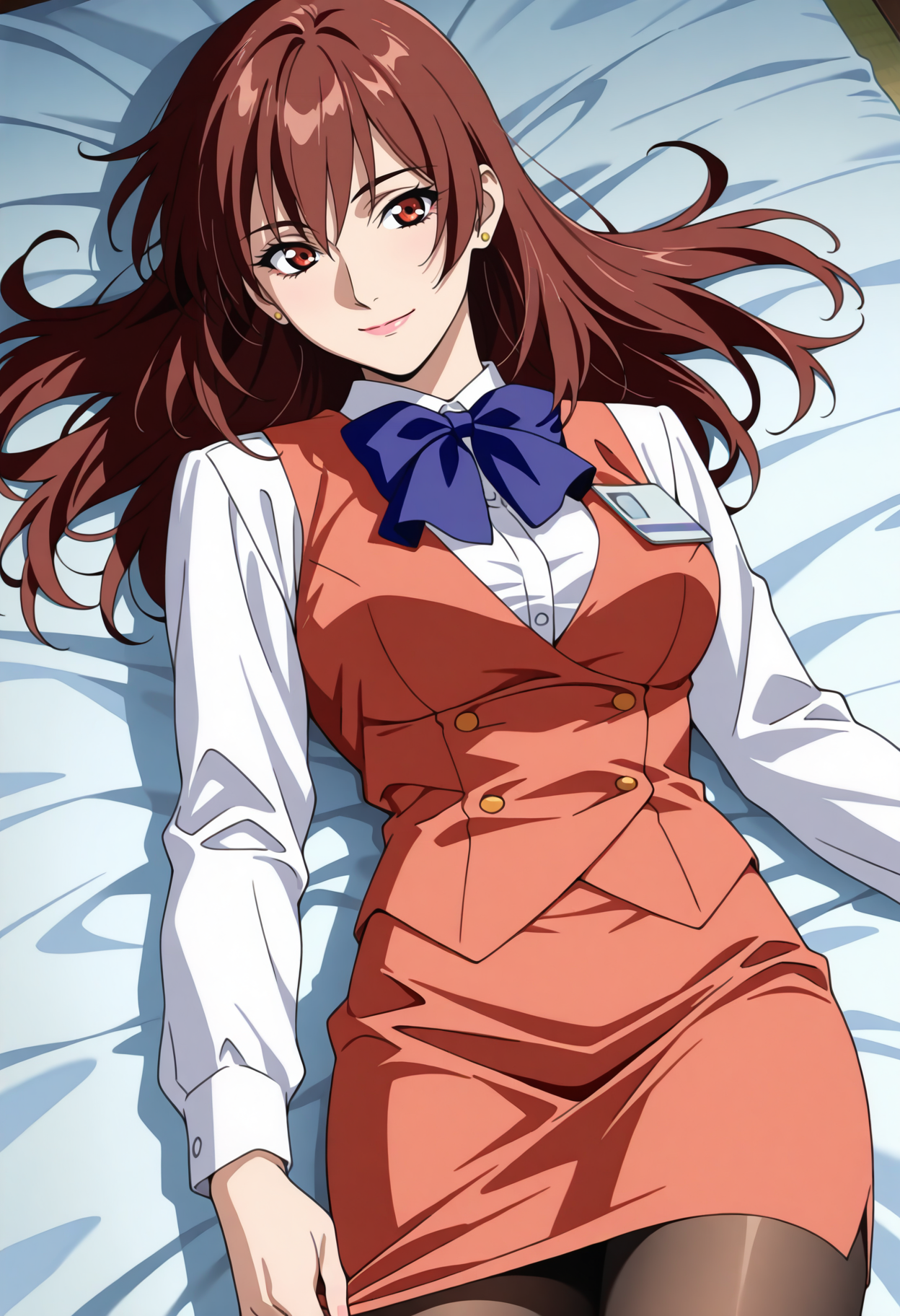 베이스: a_rena, 1girl, 애니메이션 색감, 레트로 아트스타일, 싱글, 긴 머리, 갈색 붉은 머리, 눈 사이의 머리카락, 귀걸이, 붉은 눈, 입술, 립스틱, 레나 유니폼, 파란색 리본넥타이, 빨간 조끼, 칼라 셔츠, 긴 소매, 이름표, 연필 스커트, 빨간 스커트, 중간 크기 가슴, 팬티스타킹,