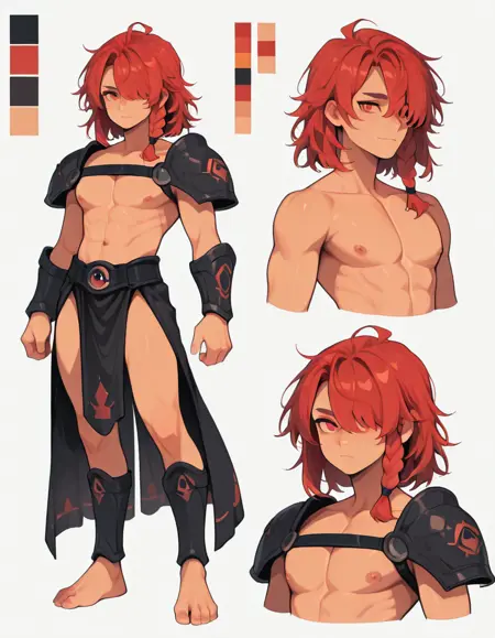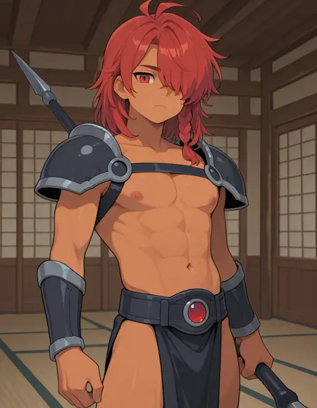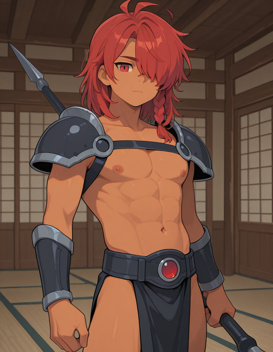 | 训练词汇 | Enialio_greek_mythology, 1boy, male focus,,已复制! red eyes, hair over one eye, one eye covered,,已复制! medium hair, red hair, braid, single braid, side braid,,已复制! pectorals, nipples, abs, toned male, navel,,已复制! armor, shoulder armor, vambraces,,已复制! pelvic curtain, topless male,,已复制! |