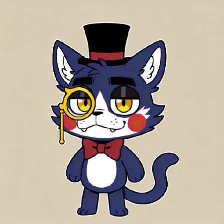 anthro cat, solo, male, black top-hat, yellow monocle, red bowtie, yellow eyes, red cheeks, black nose, black eyebrows, dark-blue fur, white stomach, white mouth, white face, white inner ears, white cheek tufts, cat tail