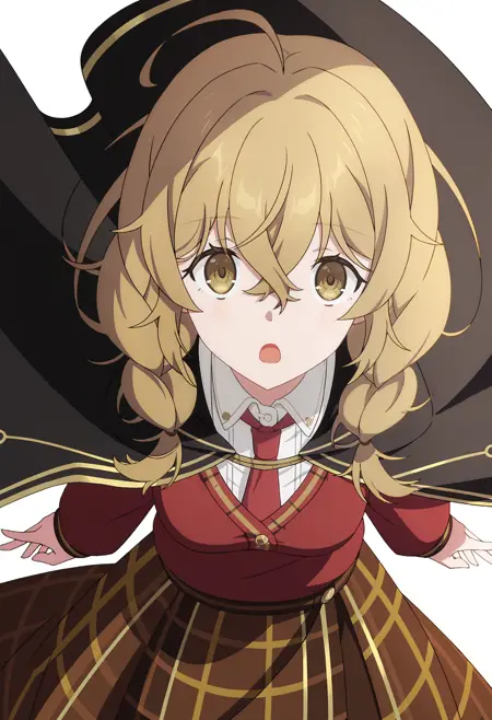 brown skirt,black cape,collared shirt,long sleeves,white shirt,red sweater,long skirt,red necktie,gold_trim,plaid skirt,