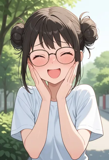solo, upper body, 1girl, double hair bun, glasses, t-shirt, kilig_pose, hands on own cheeks, open mouth, closed eyes, blush, smile, outdoor, masterpiece, 4k resolution