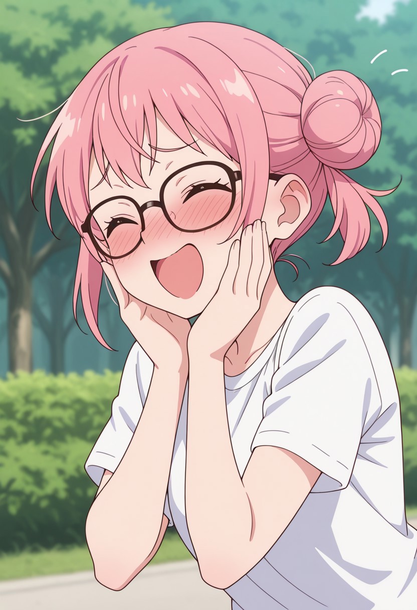 solo, upper body, 1girl, double hair bun, glasses, t-shirt, kilig_pose, hands on own cheeks, open mouth, closed eyes, blush, smile, outdoor, masterpiece, 4k resolution