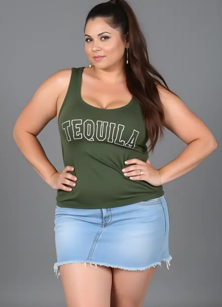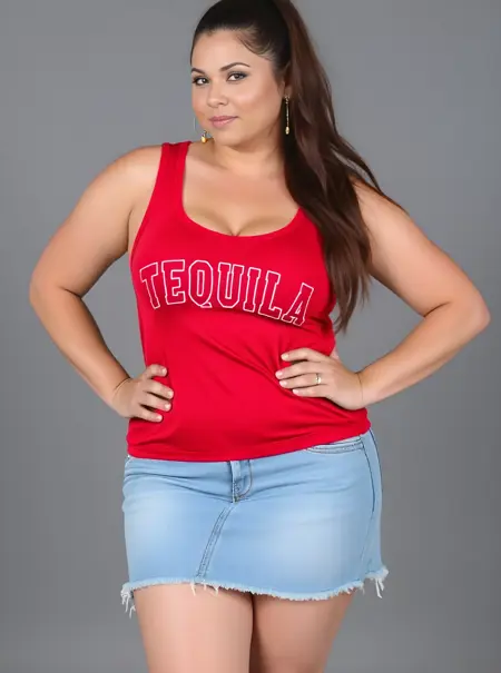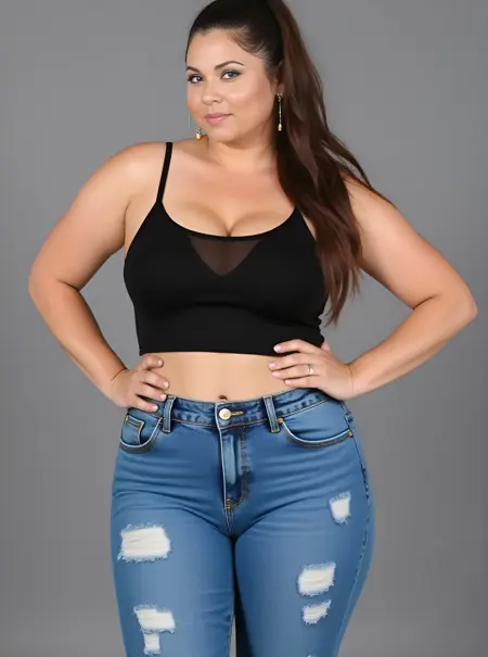 サンプルプロンプト: "Replace the woman top with TryNIXwear2025 A black Ribbed Criss Cross Halter Top, wearing distressed skintight denim jeans"