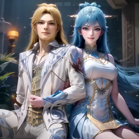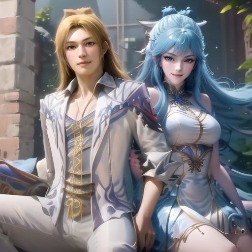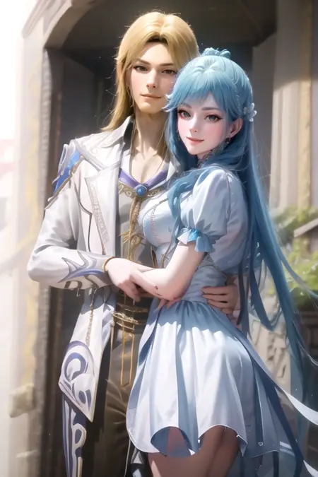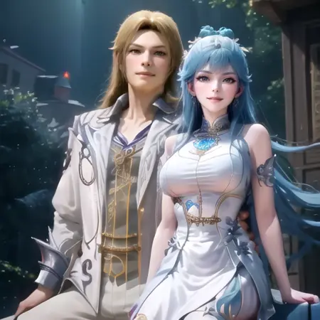 HuabinDonger, a man and a woman, hetero, standing, smile, cowboy shot