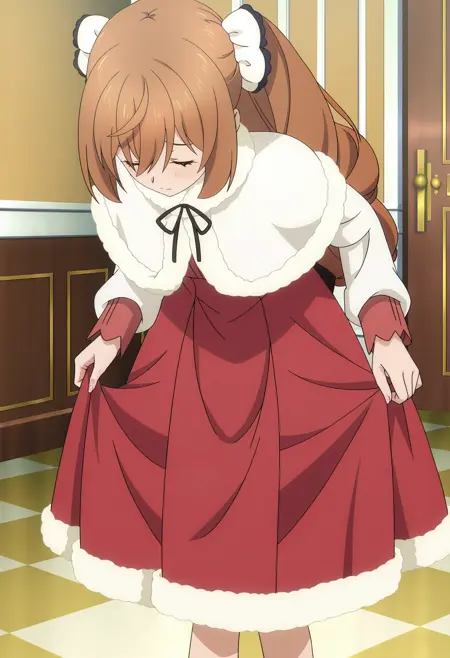 ribbon,fur trim,long sleeves,hair ribbon,white jacket,red dress,