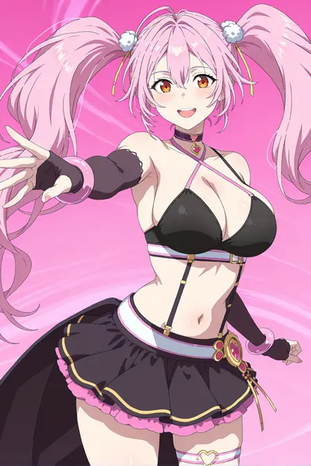 orange eyes, pink hair, long hair, twintails, hair ornament, choker, large breasts, black bra, suspenders, detached fingerless black sleeves, pink bangles, black skirt, single thigh strap, waist cape, black knee socks, pink sandals